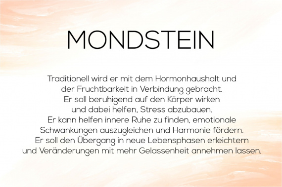 Der Mondstein gilt als Stein der Weiblichkeit, Intuition und emotionalen Balance. Er unterstützt dich dabei, dich mit deiner inneren Stimme zu verbinden, hilft bei Stimmungsschwankungen und bringt Harmonie in Herz und Geist. Besonders in Zeiten der Veränderung wirkt er beruhigend und stärkend – ein perfekter Begleiter für neue Lebensphasen.
