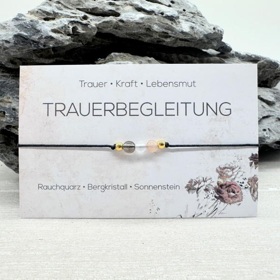 Dieses liebevoll handgefertigte Macramé-Armband ist ein symbolischer Begleiter in Zeiten der Trauer. Mit sorgfältig ausgewählten Edelsteinen – Rauchquarz, Sonnenstein und Bergkristall – soll es Trost spenden, Kraft geben und das emotionale Gleichgewicht fördern.